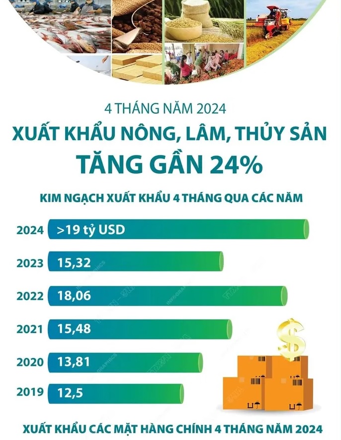 Trong 4 tháng đầu năm 2024, tổng kim ngạch xuất khẩu nông lâm thủy sản ước đạt 19,06 tỷ USD, tăng 23,7% so với cùng kỳ năm 2023.