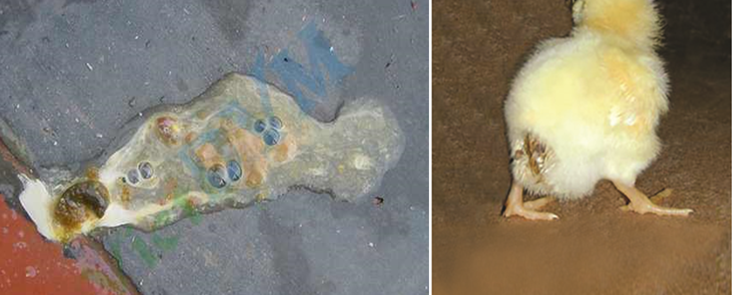 Gà đi ngoài ra phân lỏng, không nguyên khối mà chảy nước kèm theo phân có màu trắng hoặc trắng vàng hoặc hậu môn bị bết bẩn bởi phân, lông hậu môn dính vào nhau, ướt và bết dính, rất bẩn.