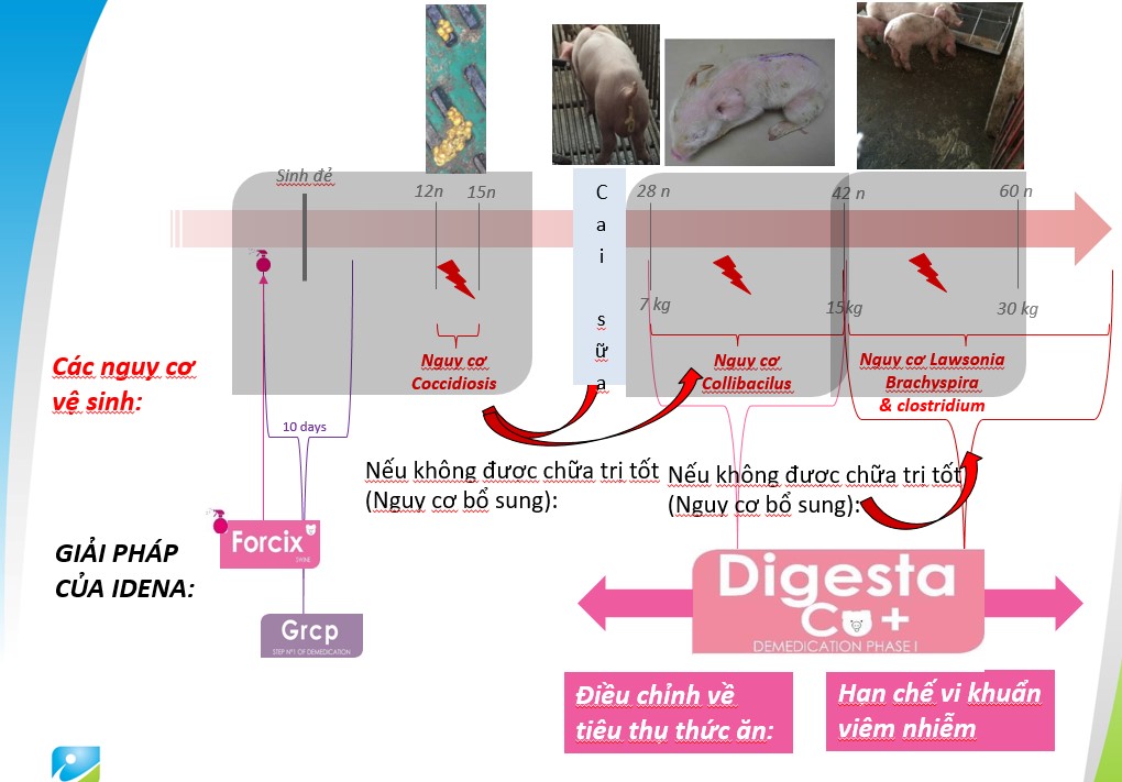 Trong những ngày đầu khi cai sữa, quá trình chuyển tiếp của ruột diễn ra chậm hơn và xảy ra tình trạng đình trệ tiêu hoá, tạo cơ hội cho hệ vi sinh đường tiêu hóa sinh sôi và tấn công niêm mạc đường tiêu hóa. Các điều kiện môi trường và thao tác chăm sóc không đúng đắn cũng làm thay đổi thời gian chuyển tiếp của ruột. Dựa vào tình trạng chung của khách hàng IDENA đã có quá trình nghiên cứu sâu về đường ruột của heo và đưa ra giải pháp bổ sung Digesta co vào công thức sản xuất TACN hỗ trợ kiểm soát bệnh tiêu chảy cho heo và giảm sử dụng lượng kháng sinh không cần thiết.