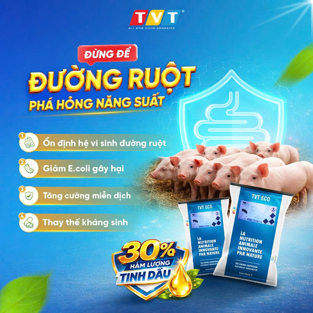 TVT ECO là phụ gia dinh dưỡng được phát triển nhằm hỗ trợ chức năng tiêu hóa và góp phần duy trì cân bằng hệ vi sinh đường ruột cho heo con.
