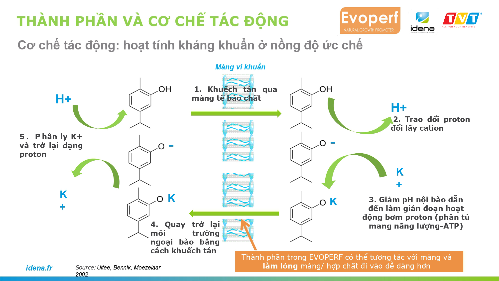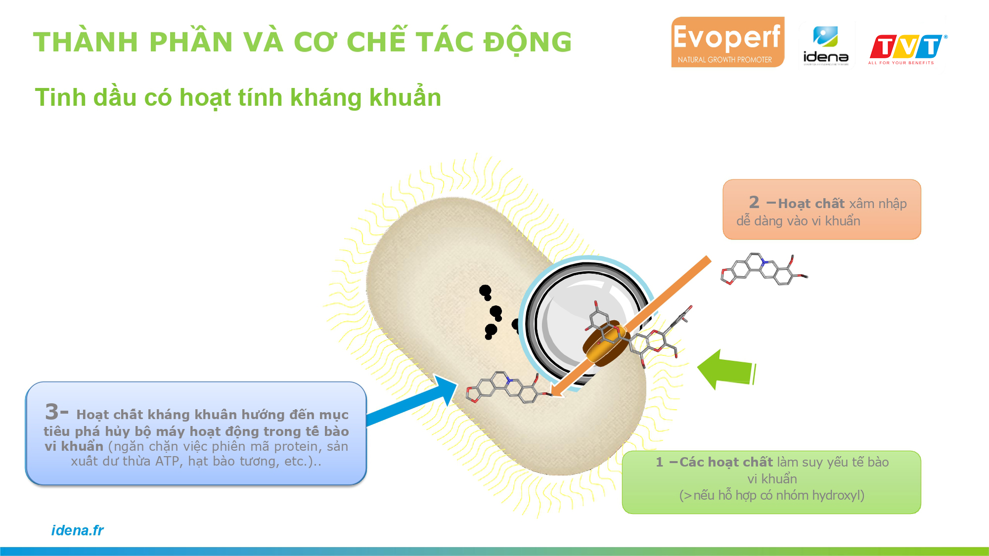 Với hoạt tính kháng khuẩn ở nồng độ ức chế thành phần trong EVOPERF có thể thay đổi tính thẩm thấu của màng và phá vỡ cấu trúc màng tế bào vi khuẩn, thay đổi môi trường nội bào