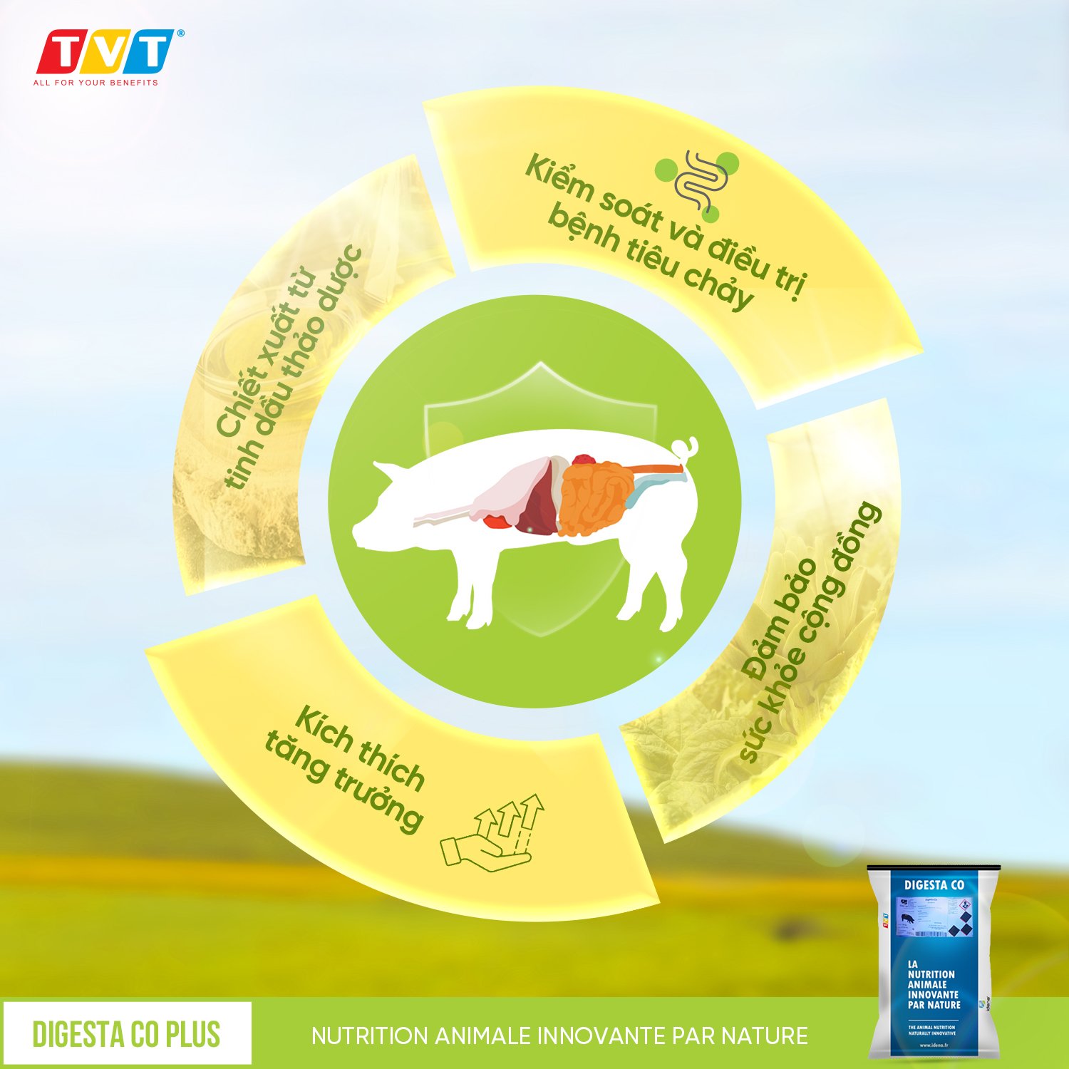 Digesta Co Plus, một sản phẩm mang tính cách mạng được phát triển bởi Tập đoàn IDENA nổi tiếng đến từ Pháp, là một giải pháp tự nhiên có nguồn gốc hoàn toàn từ tự nhiên, chiết xuất tinh dầu và thảo mộc. Với những lợi ích vượt trội, sản phẩm này nhằm mục đích kiểm soát và điều trị hiệu quả các rối loạn tiêu hóa do các tác nhân gây bệnh như E.coli và salmonella, iletis, hồng lỵ...trên heo con và heo choai.