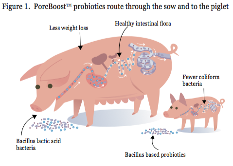 Việc sử dụng probiotic trong thức ăn cho heo cũng đã được chứng minh hiệu quả trên phương diện năng xuất và sức khỏe động vật. Các nghiên cứu đã chỉ ra rằng, probiotic có hiệu quả trong việc kích thích tăng trưởng cho heo trong việc làm giảm tỉ lệ chết và ngăn ngừa tiêu chảy cho heo con. Cung cấp probiotic cho thức ăn heo con có thể tăng 7% tăng trọng và làm giảm tỷ lệ tiêu chảy tới 40%.