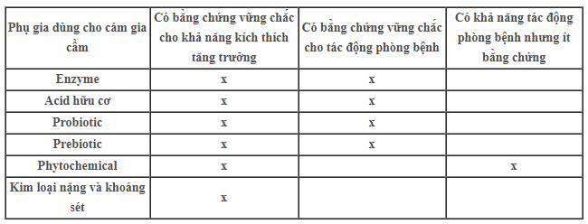 Như vậy hầu hết các phụ gia thay thế trên đều có cả tác động kích thích tăng trưởng và phòng bệnh hiệu quả trên gia cầm. Còn trên heo thì chủ yếu là tác động kích thích tăng trưởng.