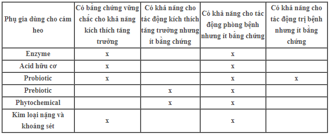 Từ các nghiên cứu cho thấy: có thể sử dụng các phụ gia sau để thay thế kháng sinh kích thích tăng trưởng với hiệu quả cao, đã có nhiều bằng chứng khoa học chứng minh và khuyến cáo sử dụng trong thương mại. Tác động cụ thể được thể hiện ở bảng dưới: