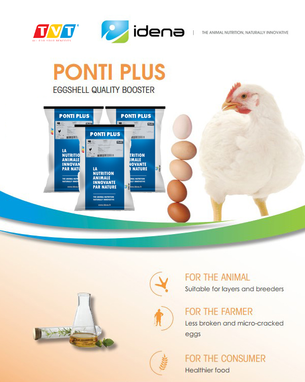 Chuyên gia dinh dưỡng động vật của IDENA khuyến nghị người chăn nuôi sử dụng Pontiplus như là một phụ gia để trộn vào thức ăn của gà đẻ từ 45 tuần tuổi cho đến cuối chu kỳ đẻ. Pontiplus là một hỗn hợp độc quyền, gồm: