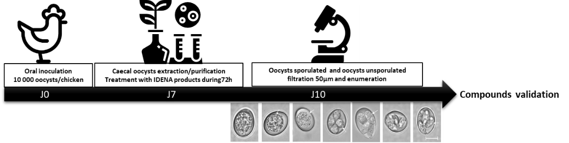 Chủng E. tenella chuyển gen đặc thù của INRAE được tạo ra mới mục đích nghiên cứu sự phát triển của ký sinh trùng trong ống nghiệm (in vitro) và xác định chính xác một nửa nồng độ ức chế tối đa (IC50) cho mỗi hợp chất. Một số hợp chất IDENA rất có tiềm năng, có thể ức chế 90% sự phát triển của ký sinh trùng.