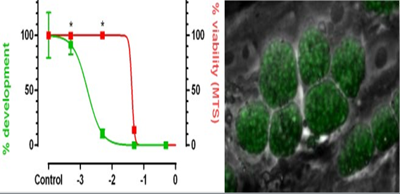 Các ký sinh trùng chuyển gen biểu hiện gen β-Gal đã được nhóm INRAE phát triển nhằm tạo điều kiện thuận lợi cho việc đánh giá quá trình này. Một loạt các liều lượng hợp chất IDENA đã được ủ trước với các thoa trùng (giai đoạn xâm nhập) và khả năng xâm nhập các đơn lớp của tế bào biểu mô của ký sinh trùng được định lượng bằng độ hoạt hóa β-Gal. Một số hợp chất đã tiếp tục được lựa chọn vì có thể giảm 50% sự xâm nhập vào tế bào.