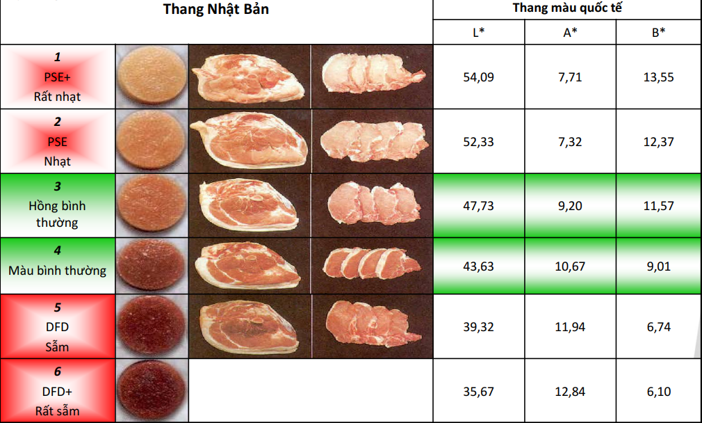 -> Tại thời điểm giết mổ và đặt thước đo lên các phần nạc trên toàn bộ các bộ phận của lợn đều cho màu từ cấp độ 4 đến cấp độ 5 là các mức thị trường chấp nhận cao