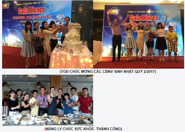 Cũng trong buổi tiệc, Công ty Cổ phần Tiến Việt Thái đã tổ chức sinh nhật cho các cán bộ nhân viên sinh vào Quý 2/2017. Đây là hoạt động diễn ra thường xuyên tại Công ty nhằm khích lệ tinh thần tập thể, nâng cao tình đoàn kết và gắn bó giữa các bộ phận trong Công ty. Trong bữa tiệc , Tổng Giám Đốc Nguyễn Quốc Toán đã có đôi lời phát biểu và gửi lời chúc sức khỏe, hạnh phúc và thành đạt đến các CBNV có sinh nhật trong dịp này.