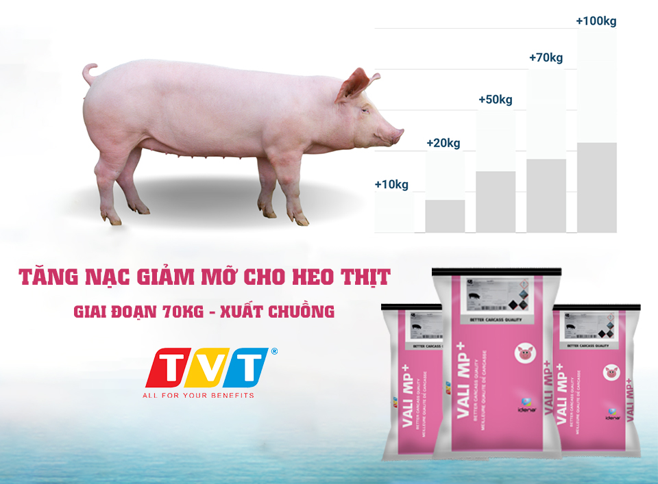 Vali MP Plus là Sản phẩm là hỗn hợp chiết xuất Laminarin từ Tảo, chiết xuất Hydroxycitrate từ Atiso đỏ, Cynarine từ Atiso trắng và các chất khoáng mangan sulphate mangan chelate của glycine. Giúp làm tăng lượng ăn thức ăn trong suốt quá trình nuôi thịt và cải thiện chức năng của chu trình chuyển hóa Năng lượng và Protein, giúp heo phát triển tốt giai đoạn 50kg- xuất bán. Đặc biệt tạo cơ bắp đồng đều, làm giảm mỡ cổ và mỡ lưng, tăng lượng thịt nạc, giúp thịt đỏ và đẹp không bị tái nhão và mất nước (PSE). Kích thích tăng trưởng, tăng ADG, giảm FCR.