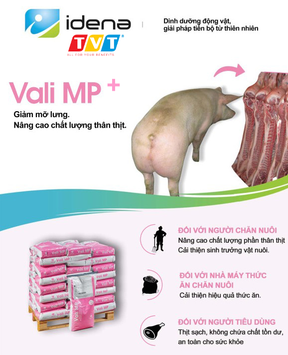 Cuối cùng, Idena đã bổ sung vào ValiMP+ một hỗn hợp (Chalates của khoáng, các chiết xuất thực vật) làm màu thịt đỏ hơn, đẹp hơn, đưa ra một sản phẩm hết sức toàn diện cho ngành chăn nuôi heo.